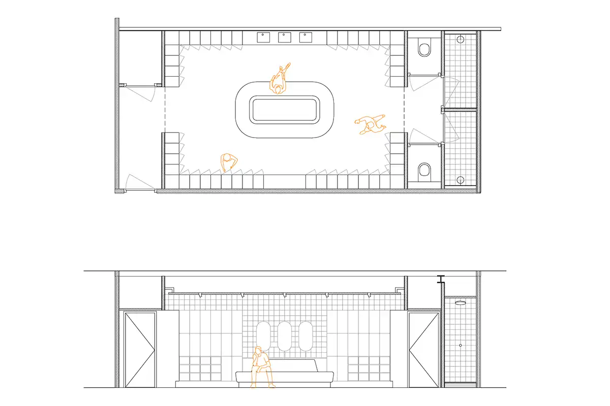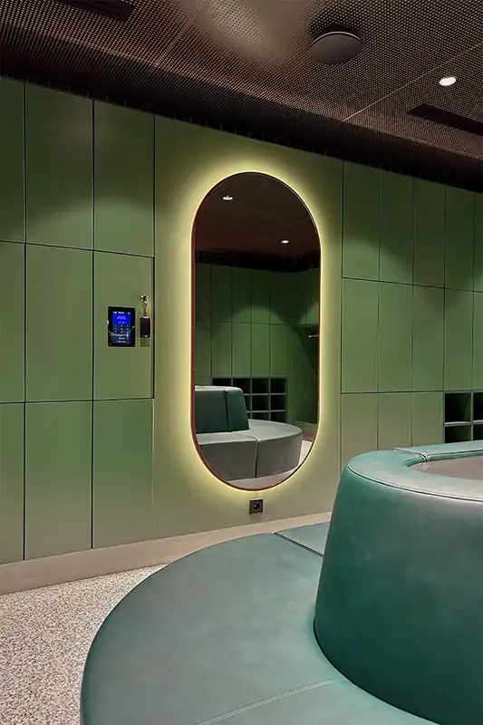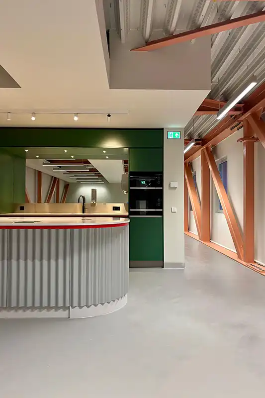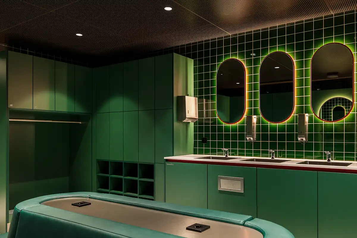 Op de verdieping bevindt zich een woonkamer met open keuken, waar medewerkers in hun pauzes en na hun dienst kunnen samenkomen om te ontspannen, te eten en te drinken. Daarnaast zijn er twee ruime kleedkamers met toiletten en douches, die door hun overzichtelijke opzet, ingetogen kleur- en materiaalgebruik ruimte bieden voor rust en privacy.
